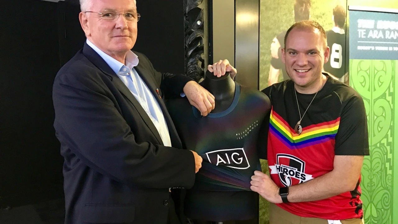 David Rutherford, former Chief Human Rights Commissioner, and I are stretching the All Blacks rainbow rugby jersey.